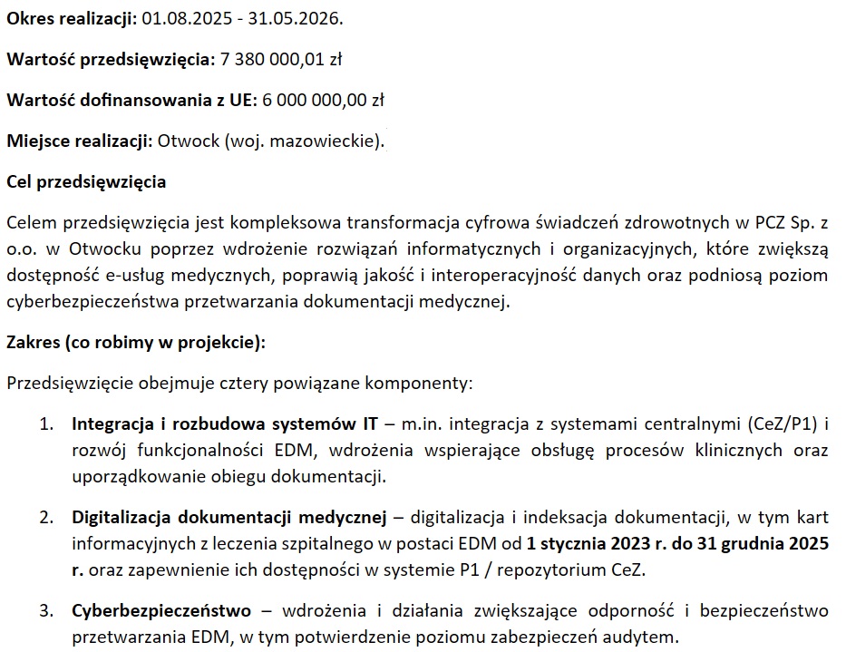 Transformacja cyfrowa Powiatowego Centrum Zdrowia Sp. z o.o. w Otwocku – bezpieczne i nowoczesne usługi zdrowotne
